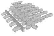 The larger 12-gun sets are split for added flexibility. Some weapons are arranged like those in the smaller set, while the rest come with both hands attached and posed to match the most common alignment for that set. For example, the 12-gun “30k” set is optimized for standard 30k (Heresy) models. Note that Firstborn sets feature a single gripping hand on the weapon and do not include any extra loose hands to hold the gun stock.*