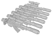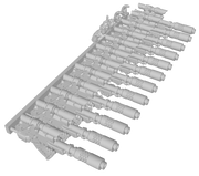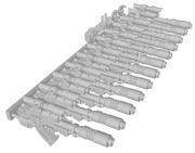 The larger 12-gun sets are split for added flexibility. Some weapons are arranged like those in the smaller set, while the rest come with both hands attached and posed to match the most common alignment for that set. For example, the 12-gun “30k” set is optimized for standard 30k (Heresy) models. Note that Firstborn sets feature a single gripping hand on the weapon and do not include any extra loose hands to hold the gun stock.*