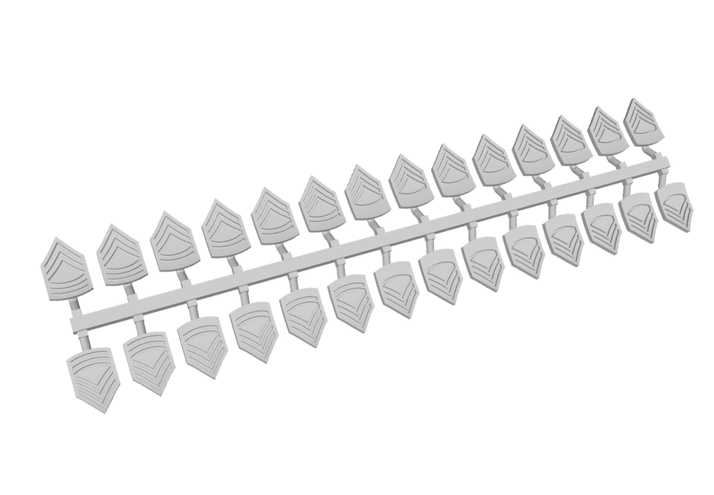 These Shoulder Shield Ranks are engraved onto a smooth and wider tilt shield than the formal set. This element is designed to be added to the edge of any shoulder pads like a tilt shield. They are inspired the Heraldic Escutcheons that adorned a knight’s armor in the days of chivalry. Sold unpainted, each shoulder shield are curved with a glue-point block on the back to insure a proper fit. These should fit both the new and classic 28mm scale, space marine or chaos marine models.*